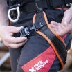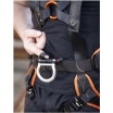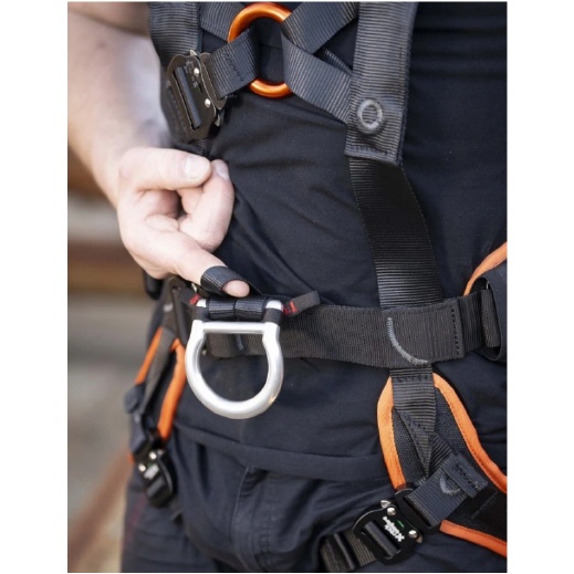 Im Gegensatz zu ähnlichen Gurten anderer Hersteller ist der vordere Anschlagpunkt (EN 361) nicht zweigeteilt, sondern besteht aus einem einzigen Aluminiumring. Dadurch wird das Risiko einer falschen Verbindung deutlich minimiert.