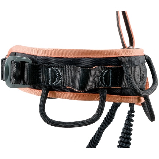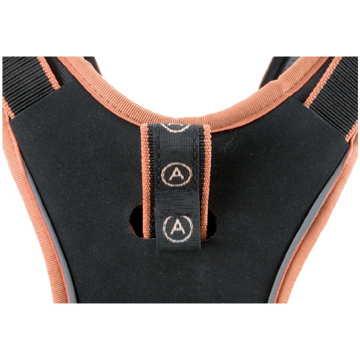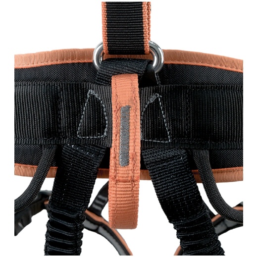 Der gepolsterte Brustgurt ist vorne mittels eines Ovalkarabiners aus Aluminium mit Twist-Lock-Verschluss mit dem Sitzgurt verbunden werden. An den gepolsterten Schulterbändern sind Schlitze angebracht, an denen kleine Gegenstände oder Werkzeuge befestigt werden können.
