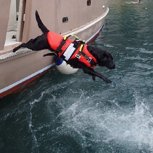 Entwickelt für Rettungshunde und nützlich für alle Hunde, die im Wasser oder auf einem Boot arbeiten.