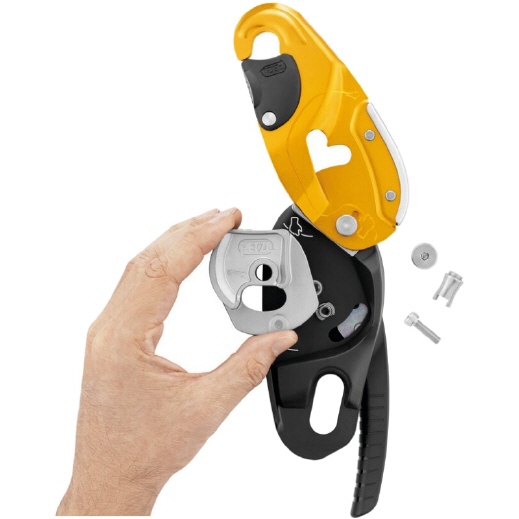 - Wenn das Seil entfernt wird, geht der Hebel automatisch in die „Parkstellung“. Dadurch wird das Risiko reduziert, dass sich das Abseilgerät verhakt, wenn es am Gurt getragen wird