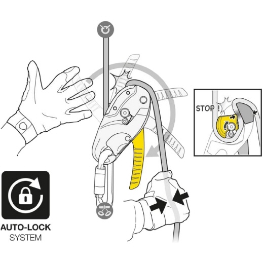 - Nach der Blockierung sind kurze Aufstiege am Seil möglich, indem das Seil ohne Betätigung des Hebels eingezogen wird