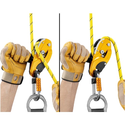 Ebenfalls für Flaschenzüge mit loser Rolle oder für kurze Aufstiege am Seil verwendbar (bei Verwendung zusammen mit einer Trittschlinge und einer Seilklemme mit Griff). Eine (auf der Rückseite des Geräts integrierte) Schraube ermöglicht die Verriegelung des beweglichen Seitenteils, wenn das RIG als Bestandteil eines Rettungskits verwendet wird.