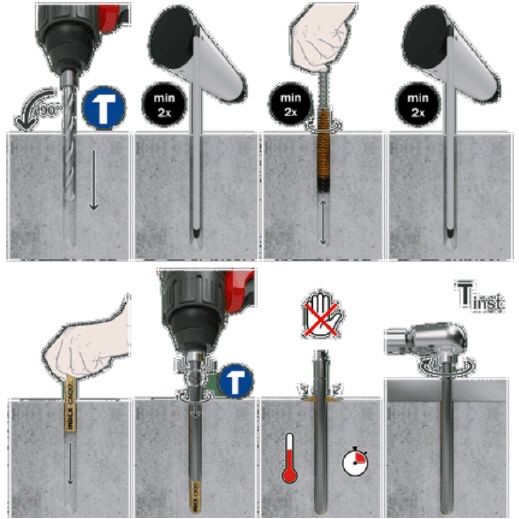 Das Bohrloch muß in der richtigen Art und Weise (Tiefe, Winkel, Fels Vorbereitung...) gebohrt werden. Dann reinigt man das Bohrloch z.B. in dem man den Bohrer (ohne Hammerfunktion) unten im Bohrloch ansetzt und mindestens 3-mal unter dehen nach außen führt. Oder mittels einer Bürste, eines Ausbläßers oder dünnen Schlauchs mit dem Mund.