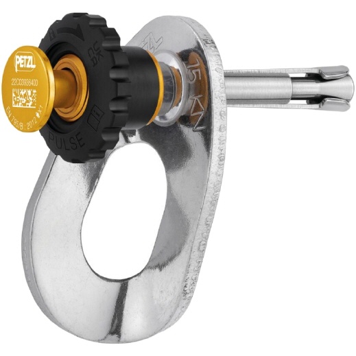 Bohrhaken der schnell gesetzt und wieder entfernt werden kann. Der Bohrhaken bestehend aus einer Aluminiumlasche und einem Bohrhaken aus rostfreiem Stahl, bestimmt zum Hängen und für den Seileinbau in der Speläologie.