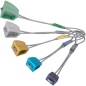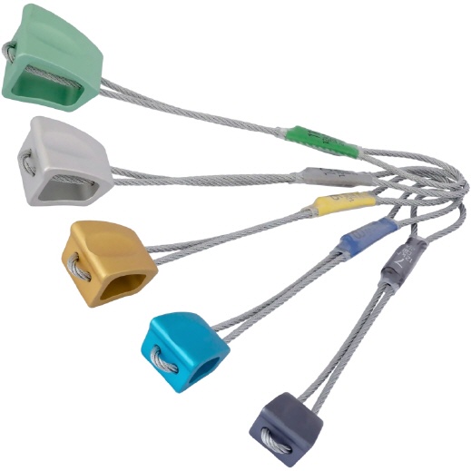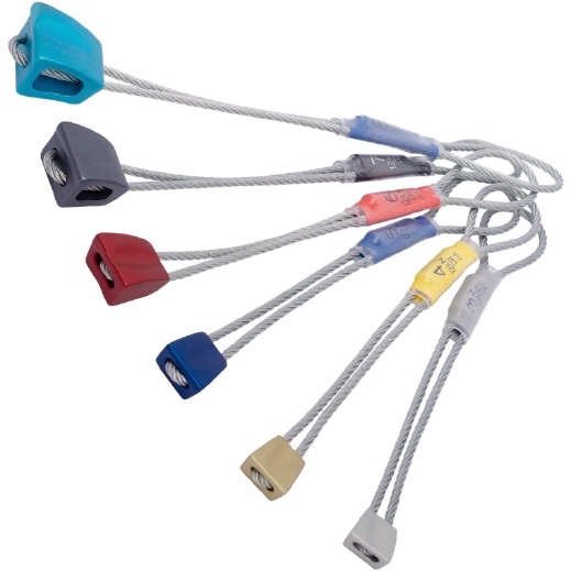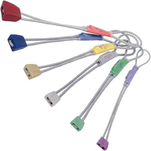Wallnuts sind auf Drähten montiert, die steif genug sind, um Überkopfplatzierungen zu ermöglichen, aber dennoch flexibel genug, um das Herausheben zu verhindern. Sie sind farblich gekennzeichnet.