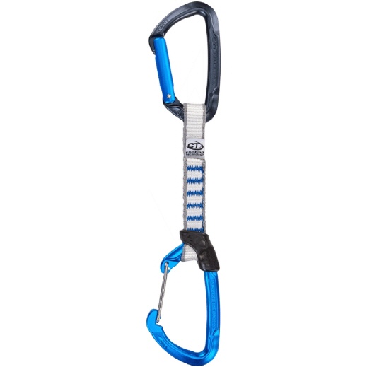 - unterer Karabiner mit Drahtschnapper, der das Einführen des Seils erleichtert und das Schwingen des Schnappers beim Aufprall auf den Fels verhindert