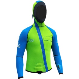 Bequeme wie robuster Neoprenjacke fürs Canyoning mit Kopfhaube und Kameratasche.