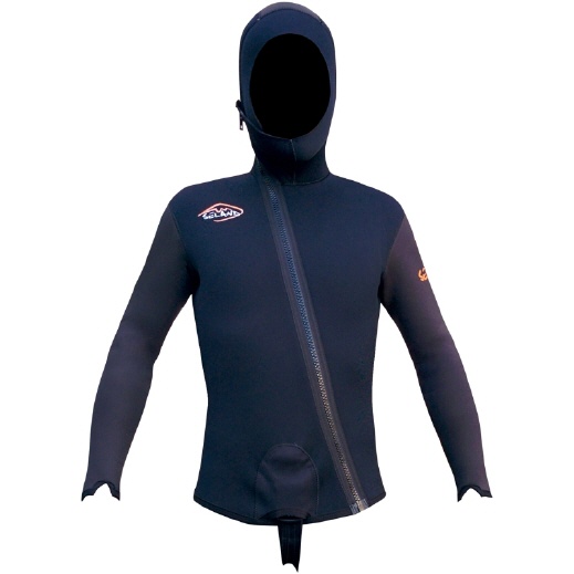 Die 5 mm dicke Jacke ist mit einem seitlichem YKK-Reißverschluss bis zum Kinn ausgestattet.