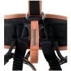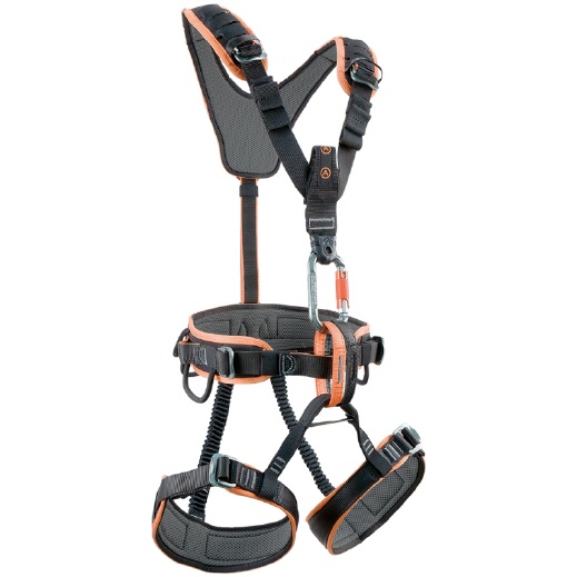 Der gepolsterte Brustgurt ist vorne mittels eines Ovalkarabiners aus Aluminium mit Twist-Lock-Verschluss mit dem Sitzgurt verbunden werden. An den gepolsterten Schulterbändern sind Schlitze angebracht, an denen kleine Gegenstände oder Werkzeuge befestigt werden können.