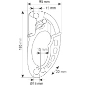 Die Griff- und die Seilachse sind komplanar und ermöglichen eine perfekte Lastausrichtung. Zwei breite untere und eine obere Einhängeöffnung bieten die Möglichkeit, die Organisation der Verbindungen zu optimieren. Die Seilführe aus rostfreiem feingegossenem Edelstahl verleiht der Einhängeöffnung eine außergewöhnliche Verschleißbeständigkeit und sichert die Position des Karabiners, welcher sich so nicht mit dem Seil überlagert. Strapazierfähiger Körper aus Aluminiumlegierung mit einer Dicke von 3.5 mm, mit geprüfter Anwendungsgeometrie für horizontale Flächen.